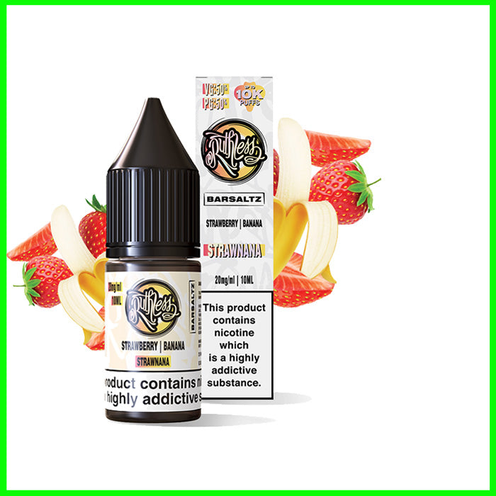 Stawnana nic salt e-liquid by Ruthless Bar Saltz features a classic combination of fruity flavours. Distinct notes of strawberry are blended with ripe-tasting banana to deliver a vape that’s layered and sweet.